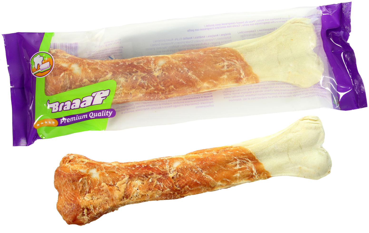 Uw hond zal zeker smullen van Braaaf geperst been omhuld met heerlijk kippenvlees! Door het heerlijke vlees om het bot heen is dit bot zelfs smakelijk voor de kieskeurige honden!