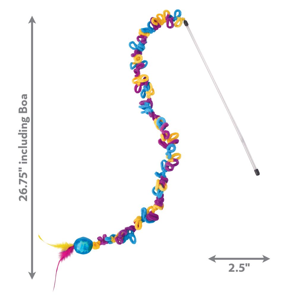 Dit speelgoed van KONG voor actieve katten is de Teaser Loopz! Deze leuke speelhengel is ruim 68 centimeter lang en is gemaakt van extra lange en zachte wollen ringen, die het jaag- en vangplezier van de kat vergroten. Aan het einde van de speelhengel zit een knisperende bal met veertjes bevestigd. De veertjes bieden een interessant visueel doel om te bespringen en de bal, gemaakt van glanzende en knetterende stof, creëert geluidjes bij aanraking. Een bonus is de verwerking van het KONG North American Premium Catnip, waardoor katten langer blijven spelen!