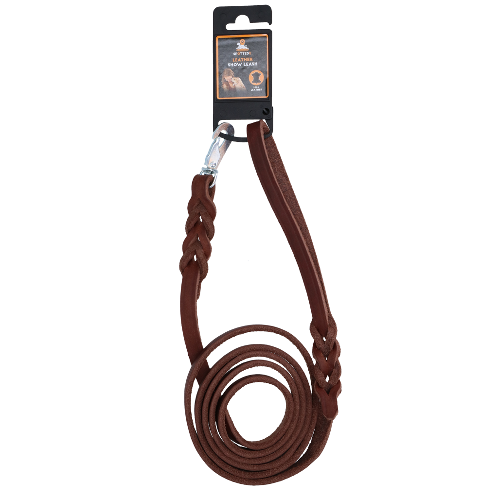 Spotted! Pro Hoogwaardige kwaliteit lederen showlijn! Gun jezelf en jouw hond het beste met deze topkwaliteit lederen showlijn! Niet alleen praktisch maar ook een blikvanger! Voorzien van prachtig vlechtwerk bij het handvat en het bevestingingspunt van de halsband. In combinatie met het prachtige leer zorgt dit voor een zeer chique uitstaling! Gemaakt uit het bovenleer van het rund. Dit is volledig doorgelooid is dus zacht en soepel. Dankzij dit looiproces is de huidstructuur nog zichtbaar voor een prachtige natuurlijke uitstraling. Dit leer is afgewerkt met natuurlijke olie, hetgeen de soepelheid van het leer nog verder vergroot! De metaaldelen van de lijn zijn in stijlvol en rustiek oud-zilver afgewerkt. Hierdoor mag je de volgende eigenschappen van dit product verwachten: